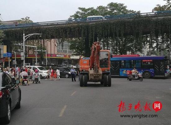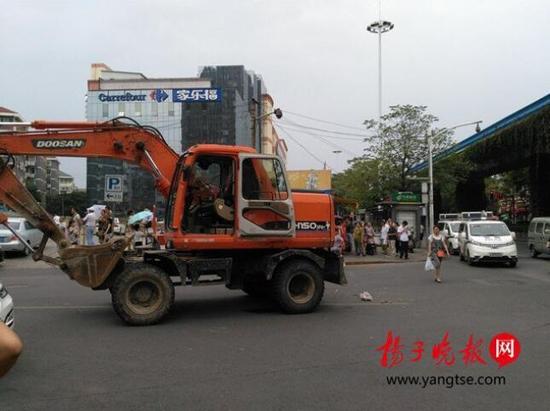 21日下午4點(diǎn)鐘,一輛無(wú)牌上路的挖掘機(jī)開(kāi)到鼓樓區(qū)大橋南路與花家橋路口右轉(zhuǎn)彎時(shí),將一名過(guò)街行人碾壓致死,警方到場(chǎng)后將司機(jī)控制住。