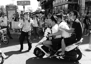 一輛違法行駛的摩托車(chē)面對(duì)交警的檢查竟然闖卡而過(guò)。首席攝影記者 吳寧/攝