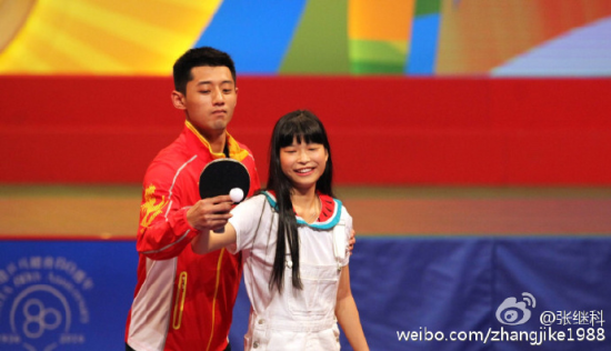 親手執拍回擊、手把手教學指導,在伊利沙伯體育館進行的乒乓球示范表演上,本來是李曉霞和一個香港小女孩打球,張繼科突然出現親身指導小女孩,手把手的教她打球的情景,引起現場觀眾的連聲尖叫。