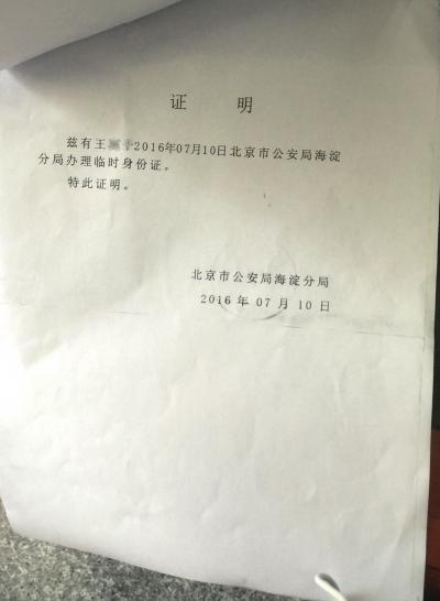 臨時身份證有效期超過90天。證明中未填寫辦理人的身份證號。當事人供圖