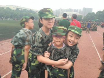 軍訓(xùn)間隙,9歲的張涵宇(中)和同學(xué)在一起。張俊蘭供圖