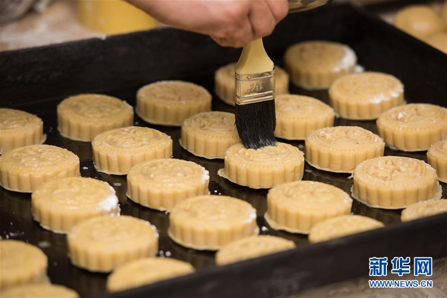 9月14日,在埃及首都開羅,“如意坊”的一位糕點師傅在給月餅坯子刷蛋液。