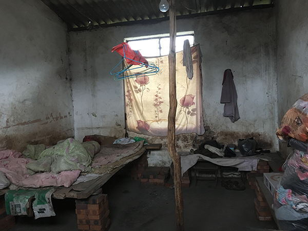 宣威市羊場鎮大松樹村涉事的盛恒磚廠的平房內,其中這一間窗戶由木板遮擋,抽掉木板后看到如此景象,被褥像多年未洗,布滿污垢。
