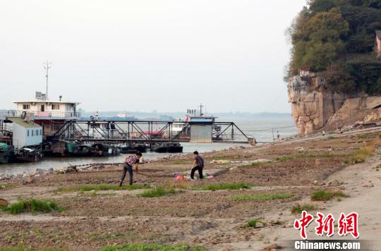 中新網(wǎng)記者27日實(shí)地探訪石鐘山時(shí)看到,石鐘山旁裸露出來的肥沃土地已“變身”菜地,附近村民在菜地中松土、拔草,辛苦勞作。隨著湖水的退卻,新開墾的菜地也不斷向湖中延伸,種下的菜種才冒出小芽。