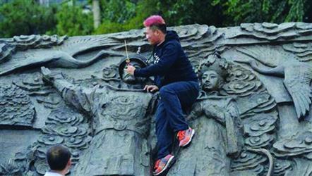 “十一”期間,沈陽故宮南側(cè)兩座再現(xiàn)薩爾滸之戰(zhàn)及清朝盛京場景的巨型浮雕群成為不少游客攀爬留影的地方,據(jù)記者觀察,10分鐘內(nèi)有近百人爬上頂端摟著“清帝”合影。