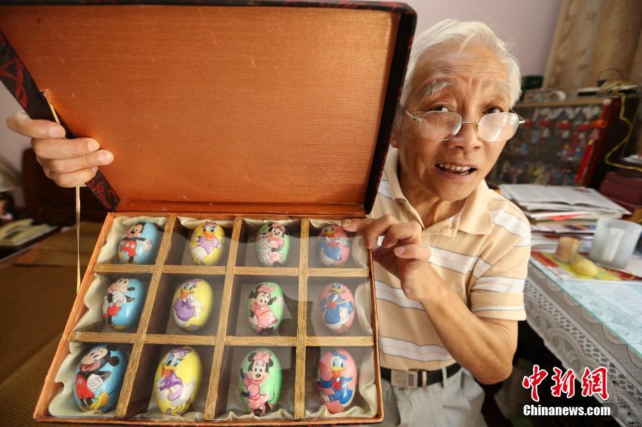 這位今年78歲的老人名叫費永泉,已經在蛋殼上作畫十余年。這些年來,費永泉創作的蛋殼畫超過2500幅。作為京劇迷,費永泉的作品囊括了《西游記》、《三國演義》、《水滸傳》、《封神演義》等古典名著中的人物形象。最近,他又創作完成了年畫、生肖以及迪士尼系類蛋殼畫作品。圖為8月底,老人展示他的蛋殼畫作品。 中新社記者 王亞東 攝