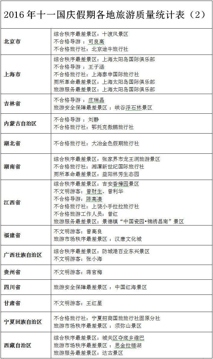 中新網10月9日電 據國家旅游局網站消息,2016年國慶假日落幕,七天長假,5.93億人次出游,無重大糾紛事件,無重特大安全事故報告。9日,國家旅游局發布十一假日旅游“紅黑榜”,集中表揚一批最佳景區、優秀旅行社、優秀導游、優秀旅游工作人員和文明游客,同時也對假日期間廁所革命滯后、環境臟亂、管理混亂、服務惡劣的旅游經營單位和從業人員以及不文明游客進行了曝光。