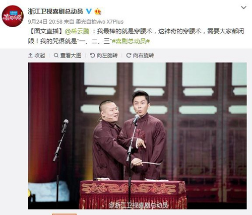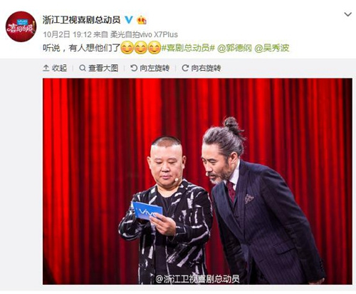 資料圖:郭德綱、吳秀波合作主持。《喜劇總動員》微博截圖