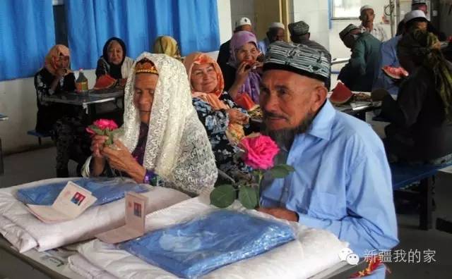 巴楚一位71歲老漢與一位114歲老太喜結良緣。兩位老人是在一家養老院認識的,老漢苦苦追求了1年才終于如愿。最后兩人去當地民政部門領了結婚證并辦理了這場婚禮。