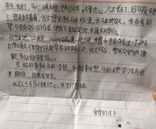 登封14歲少年離家出走,留給家人的信中寫道:”爸,我走了,兒子長大,翅膀硬了,想走出去看看,兒子不想死在大山里...”