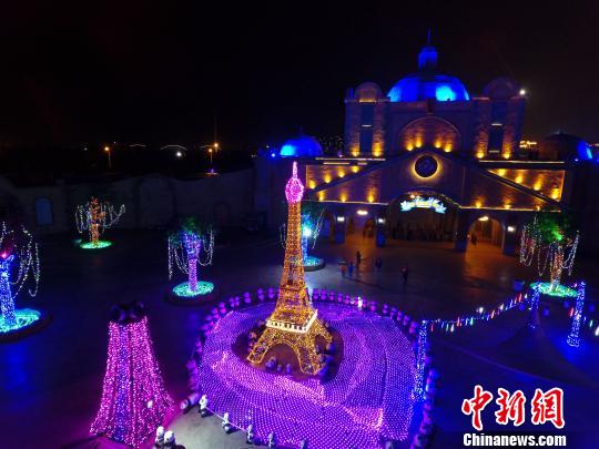 圖為航拍歡樂水魔方2016夢幻燈光秀之“埃菲爾鐵塔”。 張道正 攝