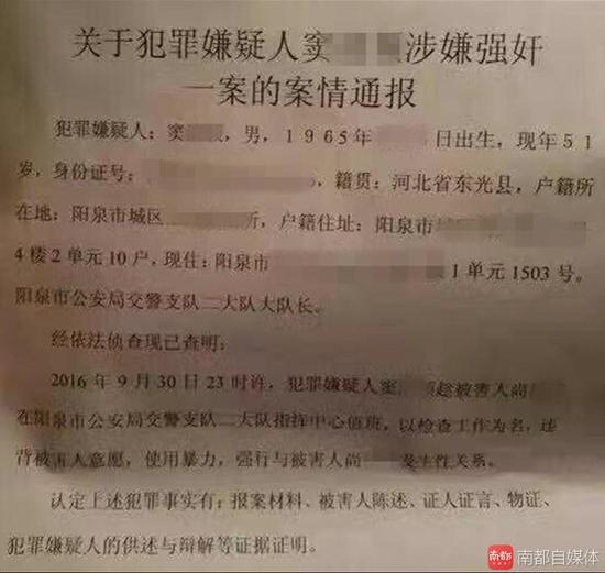 網(wǎng)傳通報顯示,竇某某,男,1965年生,現(xiàn)任陽泉市公安局交警支隊二大隊大隊長,經(jīng)依法偵查查明:2016年9月30日23時許,竇某某趁尚某某在二大隊指揮中心值班,以檢查工作為名,違背尚某某意愿,使用暴力,強行與其發(fā)生性關(guān)系。認定上述犯罪事實有報案材料、被害人陳述、證人證言、物證、竇某某的供述與辯解等證據(jù)證明。