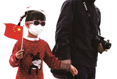 昨天霧霾繼續籠罩京城,很多孩子都戴上了大人的口罩 攝影/本報記者 郝羿