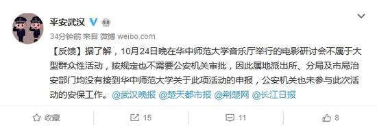 日前@平安武漢 表示這個(gè)鍋警察蜀黍不背![反饋]據(jù)了解,10月24日晚在華中師范大學(xué)音樂廳舉行的電影研討會(huì)不屬于大型群眾性活動(dòng),按規(guī)定也不需要公安機(jī)關(guān)審批,因此屬地派出所、分局及市局治安部門均沒有接到華中師范大學(xué)關(guān)于此項(xiàng)活動(dòng)的申報(bào),公安機(jī)關(guān)也未參與此次活動(dòng)的安保工作。@武漢晚報(bào) @楚天都市報(bào) @荊楚網(wǎng) @長江日報(bào)
