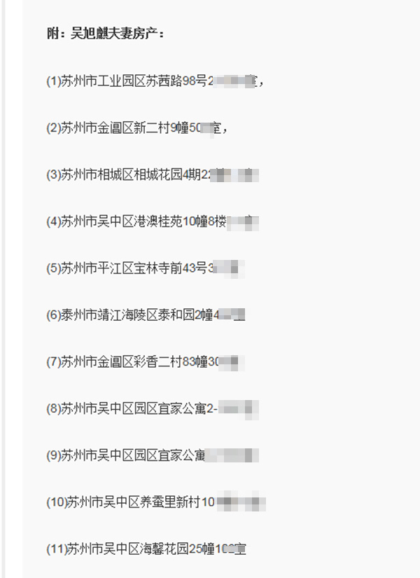 澎湃新聞?dòng)浾卟樵儼l(fā)現(xiàn),網(wǎng)帖中所列舉的吳旭麒夫妻名下的11處房產(chǎn)中,第一處即“蘇州市工業(yè)園區(qū)蘇茜路98號(hào)2-1001室”,與第八處即“蘇州市吳中區(qū)園區(qū)宜家公寓2-1001室”,系同一處房產(chǎn)。也就是說,網(wǎng)帖爆料提及的房產(chǎn)實(shí)際上共有10處。澎湃新聞?dòng)浾呦蛱K州市工業(yè)園區(qū)房產(chǎn)交易中心了解到,該公寓“曾由吳旭麒夫妻共同持有,2016年初過戶到他人名下”。