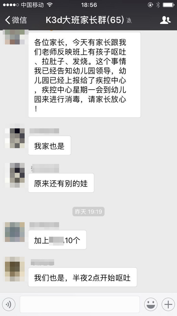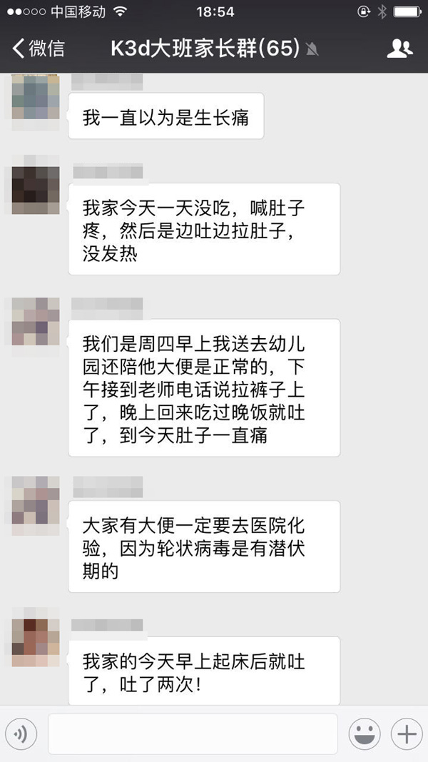 “當時我們也沒多想什么,以為只有我家孩子這樣!碑斕焱砩贤砩7點左右,班級家長微信群陸續有家長稱自己的孩子發生了嘔吐、肚子疼等情況。張溢才意識到,貝貝所在班級的好多孩子都出現了嘔吐等現象。