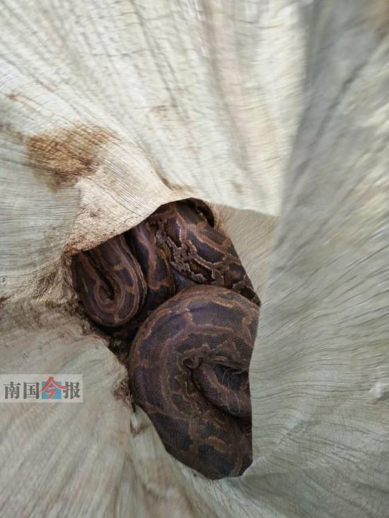 “看到這場景,雖然也感到害怕,但更多的是氣憤。”黃說,他立即跳下大腿深的洞里,緊緊抓住蟒蛇的尾巴,讓其無法往洞里鉆。接著,他騰出一只手打電話,叫在附近山頭養羊的一個村民趕來支援。