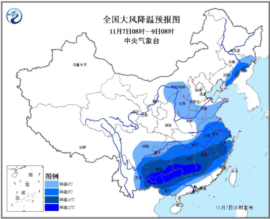 受強冷空氣影響,7日至9日,我國中東部地區將出現明顯的大風降溫天氣。南方大部地區氣溫將下降8~10℃,其中,江南中南部、華南北部、貴州、云南東部等地的部分地區降溫幅度可達10~12℃,局地12℃以上;東北地區東南部、華北西部和南部、黃淮東部等地的部分地區氣溫將下降6~8℃,局地降溫幅度可達10℃以上。上述大部地區將有4~6級風,陣風7級。我國東部和南部海區先后將有7~8級、陣風9~10級偏北風。