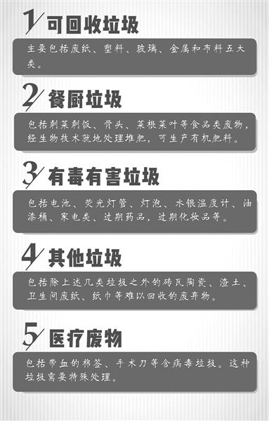記者在采訪過程中發現,不知道垃圾如何分類是許多居民的困惑。根據《城市生活垃圾分類及其評價標準》,城市生活垃圾可分為六類:可回收物(包括紙類、塑料、金屬、玻璃、織物),大件垃圾(包括廢家用電器、家具等),可堆肥垃圾(包括剩余飯菜等易腐食物類廚余垃圾、樹枝花草等可堆漚植物類垃圾等),可燃垃圾(包括植物類垃圾,不適宜回收的廢紙類、廢塑料橡膠、舊織物用品、廢木等),有害垃圾(包括廢日用小電子產品、廢油漆、廢燈管、廢日用化學品和過期藥品等),其他垃圾。有的城市還專門制定了當地的垃圾分類標準,與此也較為類似。