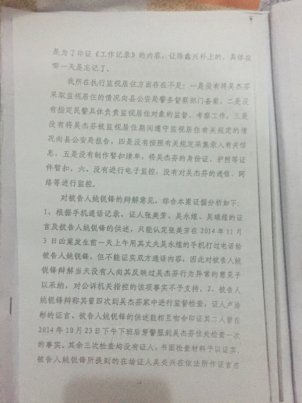 對于判決書提及的“瀆職行為”,如沒有指定民警具體負責吳杰芬監視居住的監管、考察工作;案發后曾偽造《監視居住監管工作記錄》,姚銳鋒也承認,作為轄區派出所所長,他的工作確實有所疏忽。