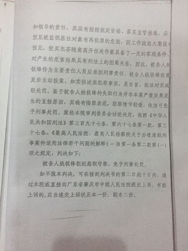 2015年11月,肇慶市中級人民法院二審判決,在案證據足以證實長崗派出所在對吳杰芬監視居住的執行過程中,確實存在監管、執行不到位的情形,并導致了嚴重結果的發生,姚銳鋒作為派出所所長未認真履行職責,其行為已構成玩忽職守罪。姚銳鋒犯玩忽職守罪,判處有期徒刑一年,緩刑二年。