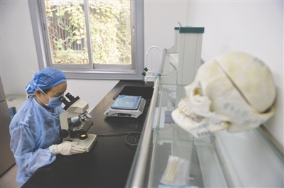14日,成都市公安局青羊區分局,法醫張鵬雨正使用顯微鏡進行檢驗工作