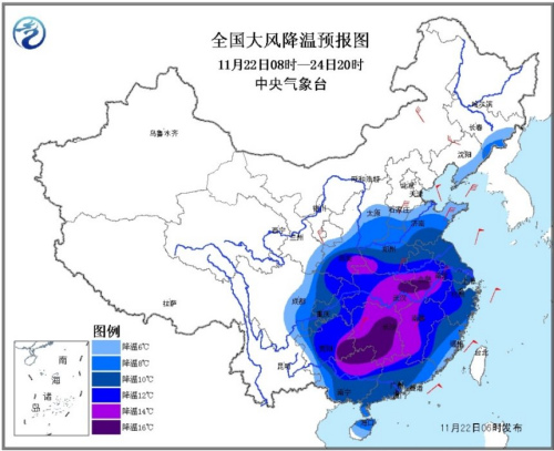 其中,陜西南部、黃淮南部、江淮中西部、江漢、江南中西部、華南北部以及四川東北部、重慶東部、貴州中東部等地氣溫將下降12~14℃,湖南中南部、貴州東南部、廣西北部等地的部分地區(qū)降溫可達16℃以上。上述地區(qū)伴有4~6級偏北風,東部和南部海區(qū)風力有7~8級,陣風9~10級。