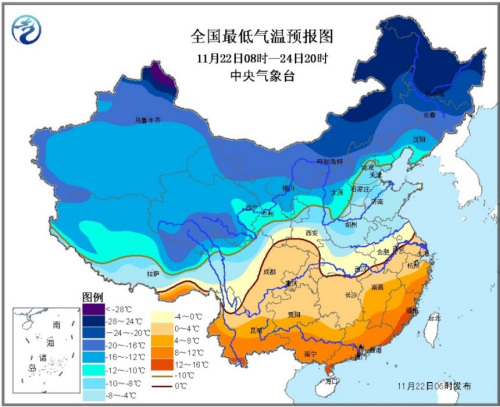 24日凌晨,華北平原北部最低氣溫將達到-10℃左右,最低溫度0℃線將位于江南北部,江南南部和華南北部最低氣溫將達到4~8℃。