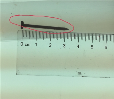 長約4厘米的鐵釘被取出時,已刺穿13歲女生的胃壁。 朱鼎兆 攝