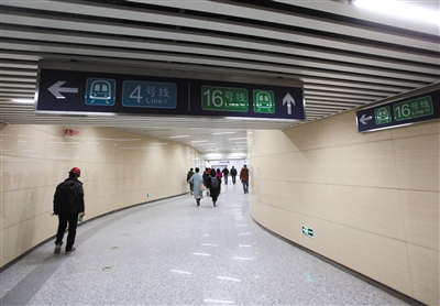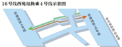 在16號線西苑站南側約120米處,是已經開通運營的4號線西苑站。16號線與4號線在西苑站“牽手”,兩線通過兩條約6米寬、120米長的Y字形通道在站廳層實現換乘,寬敞且位于同層的換乘通道將為乘客節省很多時間,從該站換乘4號線只需3分鐘。