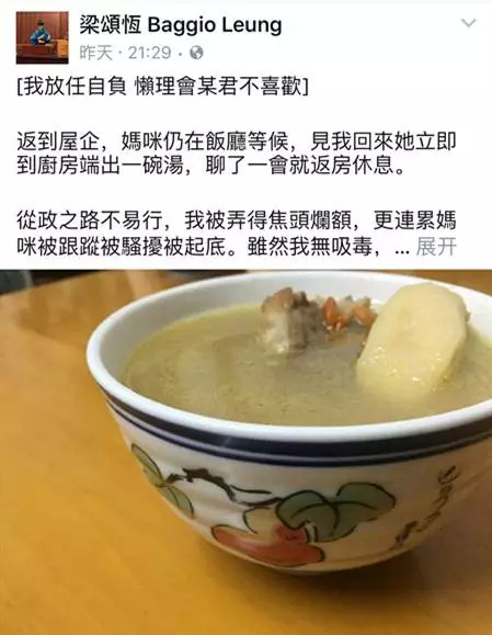 他長大后的世界不知是什么世界,我能做到的,(就是)別為社會制造多一個造反的人。簡單來說,我不想生一個梁天恒(環環注:梁天琦/梁頌恒的合稱)及游蕙禎,我要他知道什么叫做“分莊閑”(賭博術語),你可以反叛,但不可以做一些背祖忘宗、分裂國家事情,絕對不能。(如果)他做出這些事,我會親手懲戒他,希望為社會生一個就算無大貢獻,但起碼都不要破壞社會安寧的小朋友。