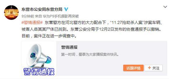 東營警方在河北警方的大力配合下,“11.27搶劫殺人案”涉案車輛、被害人岳某某尸體已找到。東營公安分局于12月2日發布的協查通報予以撤銷。