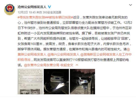 東營市公安局東營分局12月3日18:15通報,11月27日晚被劫持女孩尸體找到。