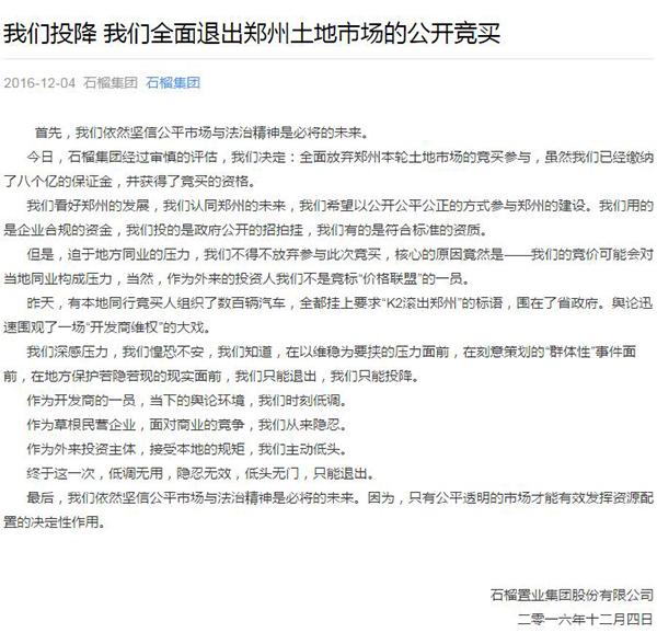 12月4日凌晨3時29分,石榴集團微信公眾號發出這樣一則消息,“我們投降,我們全面退出鄭州土地市場的公開競買”。