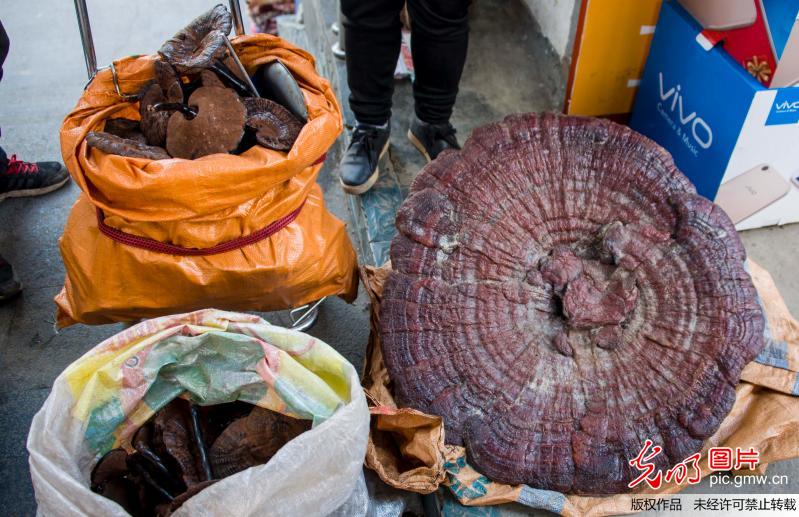 2016年12月6日,在貴州省從江縣城物資局碼頭,一位來自廣西的陸女士正在街邊兜售一朵罕見的特大靈芝。(吳德軍攝/光明圖片)