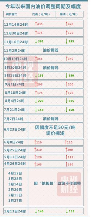 (央視財經記者 平凡 張婷敏)12月14日24時,國內成品油第24次調價窗口再次開啟。受產油國15年來首次聯手減產影響,國內油價將迎來年內第九次上調。記者剛剛從國家發改委獲悉:汽油每噸將上調435元,柴油每噸將上調420元。