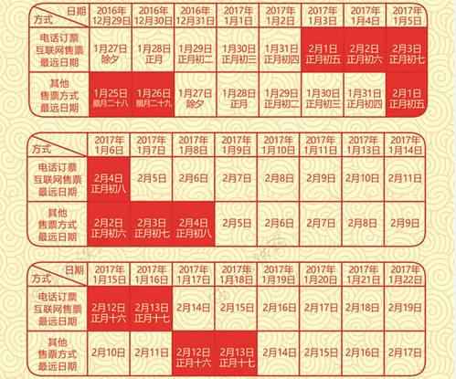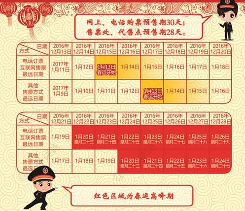 據此推算,2017年春運首日火車票網絡、電話渠道將從2016年12月15日開售,而窗口等線下渠道則從12月17日開售。