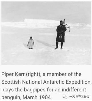 Piper Kerr(右一),蘇格蘭南極科考隊成員,于1904年3月為一只心不在焉的企鵝演奏風笛。”