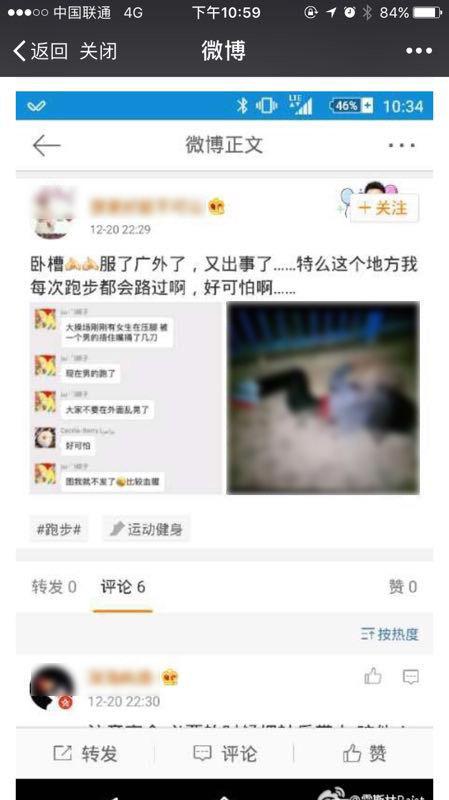 20 日晚 11 時許,有疑似目擊經過的廣外學生發布朋友圈稱,“ 麻煩各位同學不要來跟我要圖好嗎?我到現在身上每一寸肌膚每一塊肌肉都在顫抖,我看到一個女孩倒在血泊中,一動不動,脖子是血,衣服是血,臉上是血,我接受不了。” 該同學稱,自己哭著跑回宿舍,但仍心有余悸,連手機里的現場照片都不敢再點開。 21 日凌晨時分,廣東外語外貿大學就事件發布通報稱,12 月 20 日晚 10 時許,該校北校區操場與 13 棟學生宿舍之間區域發生人員不幸身亡事件。經確認,為該校繼教 ( 公開 ) 學院 2015 級進修學員。