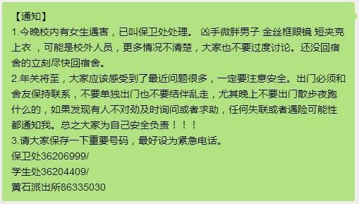 昨晚有網帖稱,廣東外語外貿大學一女生于昨晚遇害,遇害時,該女子剛跑完步,在操場上壓腿后,遭一名男子持刀割喉捅殺。而后,有疑似該校保衛部門的提醒流出,其中稱兇手是一名微胖男子,金絲框眼鏡,短夾克上衣,可能是校外人員。