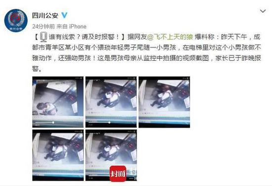 華西都市報訊(客戶端記者 李天宇)12月22日中午,成都網友@飛不上天的狼 在微博爆料,稱21日下午,自家小區混進一名年輕男子,在電梯里強吻一名小男孩,并對他作出不雅動作,男孩家長已于昨晚報警。