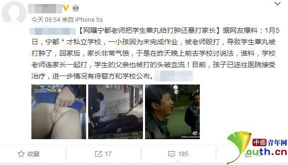 近日有網(wǎng)友爆料稱,1月5日江西寧都某私立學(xué)校一學(xué)生因作業(yè)未完成,睪丸被老師打腫,學(xué)生父親在去學(xué)校交涉時(shí)也被老師打的頭破血流,目前孩子已送往醫(yī)院接受治療。1月7日下午,該校老師告訴中國青年網(wǎng)記者,網(wǎng)上流傳的內(nèi)容皆為不實(shí)消息,真實(shí)情況是該校老師被家長手鋼管毆打,目前當(dāng)?shù)毓簿忠呀槿氪耸隆?/p>