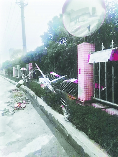 事發現場,路燈柱子砸垮鐵欄圍墻 工友供圖