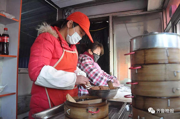 1月14日一大早,記者在無棣縣城找到了正忙著包小籠包的“用盡一生”。她本名趙平,無棣縣信陽鎮人,30歲,慈眉善目,笑起來有一種特別的吸引力。趙平的包子鋪其實就是一座簡易板房,而負責打掃這條街的70歲環衛工程延新,休息之余喜歡來這里坐坐,喝點熱水,洗洗手,聊聊天。