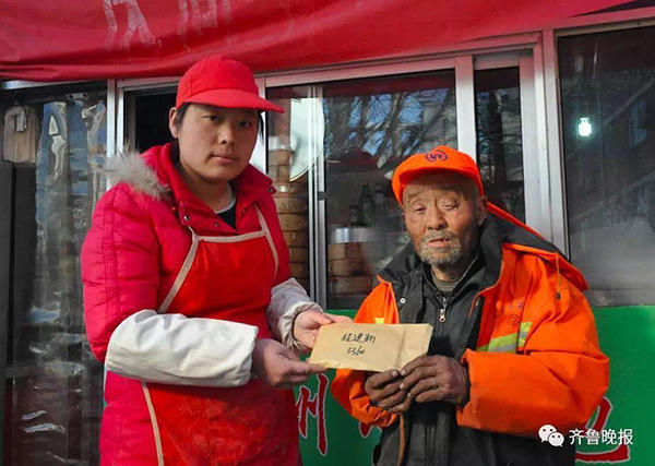 不過消息發出后不久,1月13日當天11點半左右,一個約30歲左右的小伙子開車找到了在趙平包子鋪附近打掃衛生的老程,“你數數錢對不對?” 小伙子遞給老程一個黃色的信封,信封上寫著“程建新3360”。趙平想攔住好心小伙子拍個照,結果小伙子不留姓名,上車就走了。