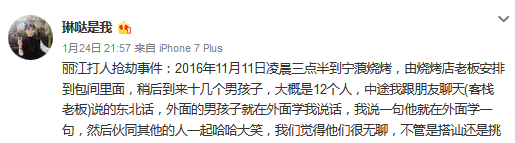 麗江打人搶劫事件:2016年11月11日凌晨三點(diǎn)半到寧蒗燒烤,由燒烤店老板安排到包間里面,稍后到來十幾個(gè)男孩子,大概是12個(gè)人,中途我跟朋友聊天(客棧老板)說的東北話,外面的男孩子就在外面學(xué)我說話,我說一句他就在外面學(xué)一句,然后伙同其他的人一起哈哈大笑,我們覺得他們很無聊,不管是搭訕還是挑釁的意思,我們沒有理會(huì),繼續(xù)吃烤聊天,隔一會(huì)對(duì)方又開始學(xué)我們說話,這一次學(xué)完我們說話還辱罵我們,之后我們就問他什么意思,是不是喝多了酒,起初他們還沒有回復(fù),之后我們就各自吃烤肉了,其中有個(gè)穿藍(lán)色馬甲的中年男人,到我們我們間的門口打量我們包間,我們就不知道什么意思,我們還是繼續(xù)吃烤肉,之后他們就拿起酒瓶子進(jìn)我們的包間,把酒瓶子砸到我們頭上,我們當(dāng)時(shí)就是暈的,之后我就被那三四個(gè)男人拉著頭發(fā)給拖到燒烤店的門口外面,一頓暴打,一邊錄視頻一邊打,之后覺得錄視頻的效果不好,又扯著我的頭發(fā)面朝天的樣子,繼續(xù)錄視頻暴打我,一邊打一邊還說:你不是東北人嚒?你不是很牛逼嗎?然后就哈哈大笑,把我打得滿臉都是血,還在拿碎掉的酒瓶子劃我的臉,之后他們?nèi)コ闊熜菹⒘耍谖伊餮倪^程,他們要求我按照他們說的話去說,不然就把我拖到山上去給埋了,威脅我的內(nèi)容是:小妹妹,你是不是自己從樓上掉下來摔成這樣的啊?要不要哥哥們幫你打120啊?要不要哥哥們救你啊?我們看你好可憐啊。我學(xué)著他們的話去說,這個(gè)過程他們是全程錄視頻的,反偵察的能力很強(qiáng),說完之后就繼續(xù)打我,又了打了一頓,最后這次打完我,臨走之前有個(gè)狠狠地踢我一腳。我直接噴血了。這一腳我直接不行啦,上不來氣了,他們走之前丟給我手機(jī),讓我自己打120 ,這是看我不行了,快死掉了,走的時(shí)候拿走我們身上帶的錢,錢包和手機(jī),三個(gè)被打得人,只留了我這一部手機(jī),還是看我不行了,給我打電話自救的,我們?nèi)齻(gè)人被足足打了半個(gè)小時(shí),他們臨走之前還揚(yáng)言說:他們就是當(dāng)?shù)厝恕⒉慌戮臁㈦S便告、還說在麗江在看到我、讓我有去無回....120是早上6:30左右來的,這期間我一直在流血,我打120的時(shí)候,我不知道燒烤店的名字,我問燒烤店的老板,他說完以后我就昏迷了,我們?cè)谶@個(gè)燒烤店被打這么久,燒烤店的老板沒有報(bào)警和打120,就眼睜睜的看著我們被打,后來警方得知這個(gè)燒烤店和那其中的一個(gè)人是認(rèn)識(shí)的,他們走的時(shí)候開著一輛白色的轎車走的。