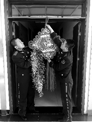 20歲出頭的新兵張虹雨(左)與戰友一起掛“福”字。