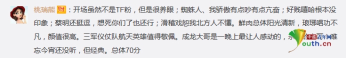 對(duì)于整場(chǎng)春晚來(lái)講,也有網(wǎng)友發(fā)表了自己的看法。網(wǎng)友“桃瑞熊”表示:開場(chǎng)雖然不是TF粉,但是很養(yǎng)眼;蜘蛛人、我驕傲有點(diǎn)吵有點(diǎn)亢奮;好賤嘻哈根本沒印象;蔡明還挺逗,想死你們了也還行;滑稽戲恕我北方人不懂。鮮肉總體陽(yáng)光清新,瑯琊唱功不凡,顏值很高。三軍儀仗隊(duì)航天英雄值得敬佩。成龍大哥是一晚上最讓人感動(dòng)的,永遠(yuǎn)的大哥!難忘今宵還沒聽,但經(jīng)典。總體70分。