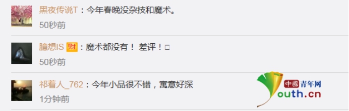 不過(guò)也有網(wǎng)友覺得美中不足,今年節(jié)目中缺少了雜技和魔術(shù)。這或許就成為下一年春晚的進(jìn)步空間了呢。