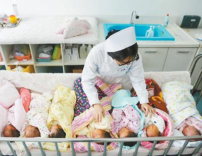 全面放開二孩政策以來,很多高齡婦女加入了生二孩的隊伍,各地醫(yī)院產(chǎn)科迎來嬰兒出生潮。圖為春節(jié)前夕,湖北襄陽第一人民醫(yī)院產(chǎn)科護士在護理新生兒。